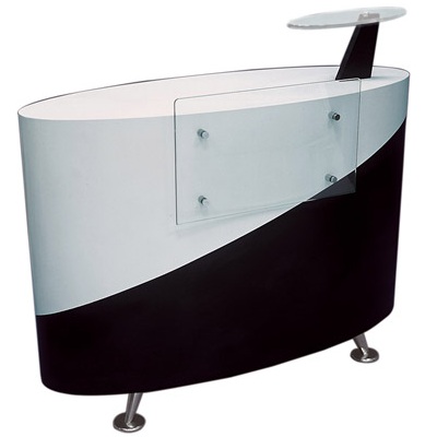 The contemporary design of this Reception Desk with an elegant oval shape in white and black color brings a focal moment to your reception area. Small glass shelf on the top to display new products. Features a solid working surface. 1 lockable drawer Storage space Width: 122 cm Depth: 45 cm Height: 109 cm (Orig.pris 1.062 EUR excl.VAT)