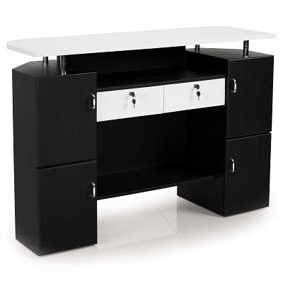 Add classical and some romantic style to your salon with this contrasting black and white Reception. Split-level solid work surface mounted on chrome rods. Inner side features: 2 lockable drawers 4 Door Cabinets Plenty of storage space. Height: 94cm Depth: 45cm Width: 135cm (Orig.pris 1.050 EUR excl.VAT)
